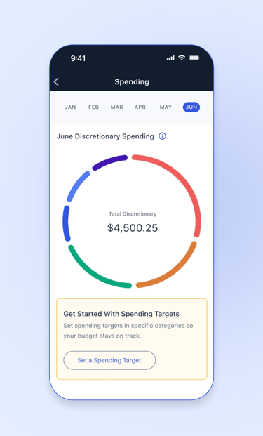 Solution: Integrated Plaid for external account connections, auto-categorized monthly spending, and provided visual insights to help clients stay on budget. The design centers around a color-coded circular chart that simplifies complex data into an intuitive summary.