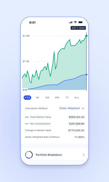 Solution: Designed a data-rich yet digestible interface for viewing market value changes, asset allocation, and rate of return. Clean visualizations communicate performance trends at a glance.